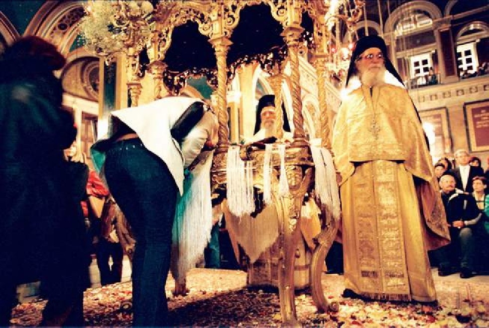Greece, Cyclads, Easter, Holy Week, Maundy Thursday, Good Friday, Passion, Pope, Metropole, priest, orthodox, religion, cult, faith, church, mass, congregation, faithful, pilgrim, ceremony, procession, flowers, ceremonial clothing.