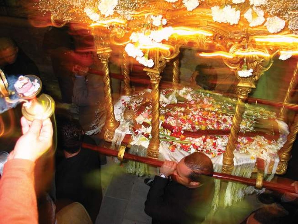 Good Friday, streets of Hermoupolis. During the procession, a worshipper comes out of her house to bring incense to the Epitaph, which represents Christ’s tomb.