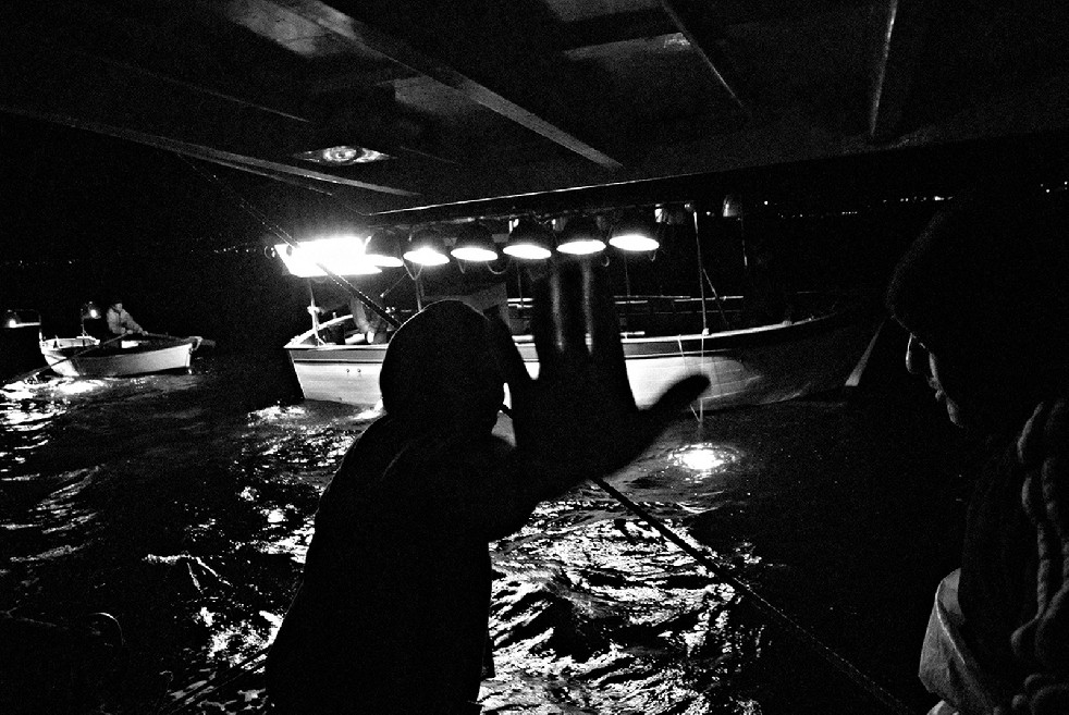 Italy. Naples. Procida. 2008. Life on board a small fishing boat ,near Procida Island. Fisherman at work